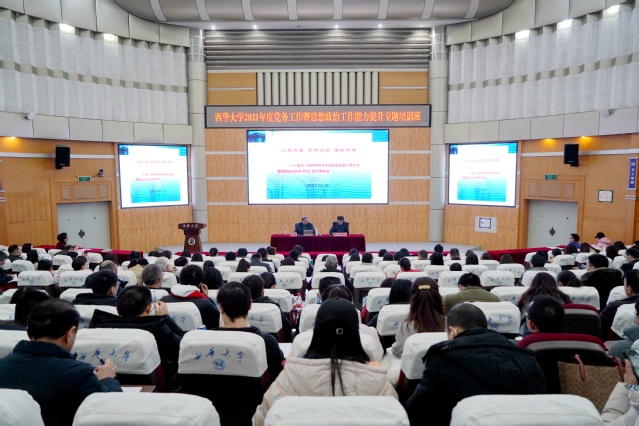 12月16日下午,西华大学2021年度党务工作暨思想政治工作能力提升专题培训班第二次培训在四教报告厅举行。本次培训的主题为“以思想政治工作高质量发展促进时代新人培育”,邀请西南交通大学何云庵教授来校作专题报告。党务工作暨思想政治工作能力提升专题培训班全体学员参加培训。校党委常委、组织部部长、党校常务副校长张力主持培训。