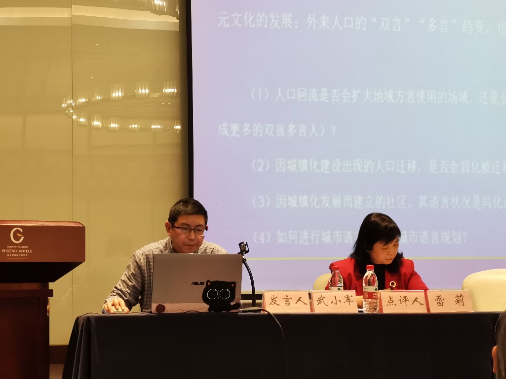 武小军教授在年会的开幕式上,受邀作了题为《城市语言多言化与语言变化驱动力》主题报告,向与会者展示了城市语言调查中,因人口流动带来的城市语言多言化格局,揭示了城市方言演化下的语言变化驱动力,研究提出的我国城市化建设中的语言问题,以及加强城市语言管理和城市语言规划等议题引起了学界的广泛关注。