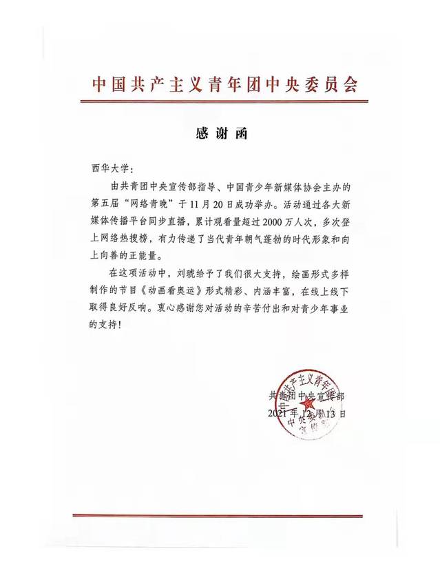 近日,我校收到来自共青团中央宣传部的感谢函,对在2021年11月20日西华大学美术与设计学院老师积极参与由共青团中央宣传部指导、中国青少年新媒体协会主办的第五届“网络青晚”活动表示感谢。