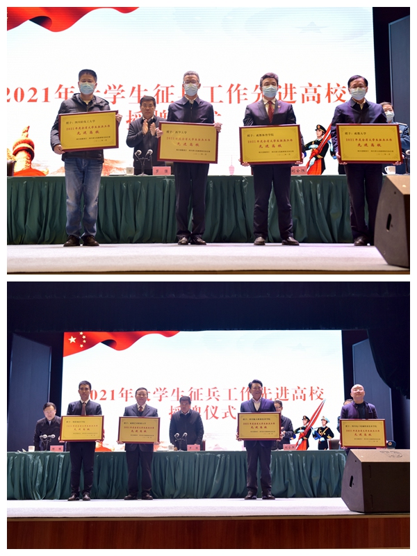 在第一阶段的工作推进会上,省军区动员局局长、省征兵办主任吴弟伦通报2021年高校大学生应征入伍征集情况,教育厅副厅长戴作安宣读2021年大学生征兵工作先进高校名单。西华大学、成都体育学院、四川轻化工大学、成都大学、绵阳城市学院、成都艺术职业大学、四川航天职业技术学院、四川电子机械职业技术学院等8所高校获评“2021年度全省大学生征兵工作先进高校”。与会领导为获评高校授牌。