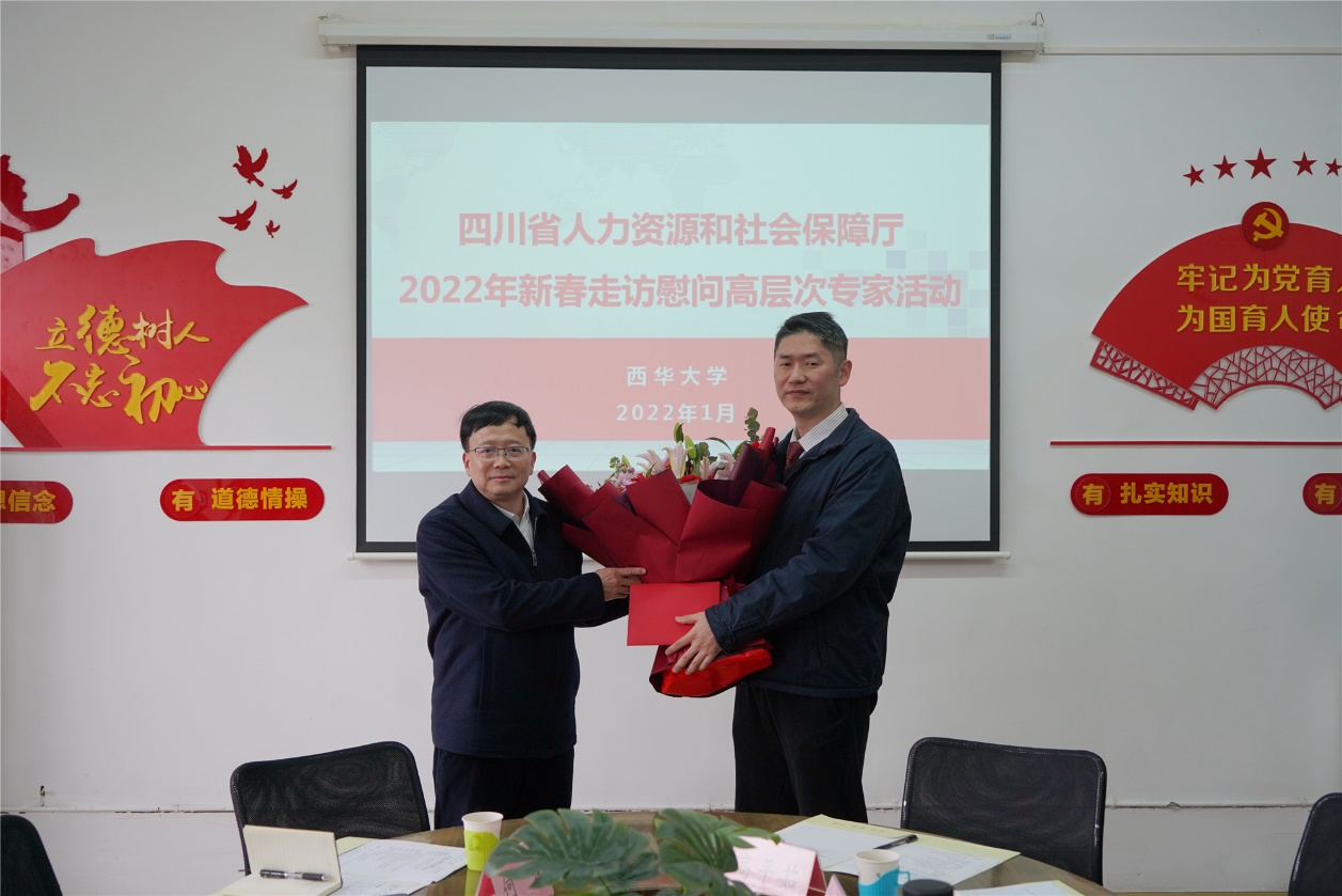 1月13日下午,正值新春来临之际,四川省人力资源和社会保障厅党组成员、机关党委书记熊义堋,事业单位人事管理处副处长戴元章,省专家服务中心副主任何蜀燕等一行5人来校走访慰问学校海外高层次归国人才、经济学院院长罗航教授,并致以节日问候。我校副校长李秋实、人事处处长樊群超等参加慰问活动。