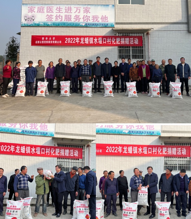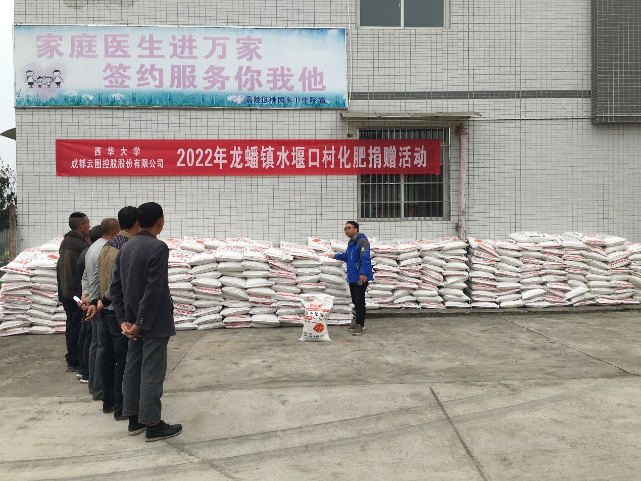 王政书与乡亲们进行了深入交流,关心他们的生产生活状况,并在龙蟠镇水堰口村文化活动室前,与受捐化肥的村民们一同举行了2022年龙蟠镇水堰口村化肥捐赠活动。成都云图控股股份有限公司总裁、我校1994级工民建专业校友宋睿此次向水堰口村捐赠了600袋复合肥,王政书将代表着学校关心和祝福的化肥发放到村民手中,鼓励大家为更美好的幸福生活共同努力。村民们纷纷表示:非常感谢帮扶单位西华大学对春耕生产的关怀和支持,大家都非常高兴,提高了大家种粮的积极性和实现丰收的信心。