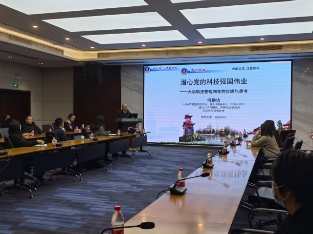 为提升我校科技管理服务工作质量,助推学校科研工作更上一个台阶,4月15日上午,学校在行政楼101报告厅召开了科技管理服务报告会。16U科技联盟第1-9届秘书长、第10届高级顾问何勤功教授受邀来校作了题为“潜心党的科技强国伟业——大学科技管理38年的实践与思考”的报告。各学院科研副院长、科研秘书、省级以上科研平台管理服务人员、科技处全体人员参加会议。报告会由科学技术与人文社科处处长郎方年主持。