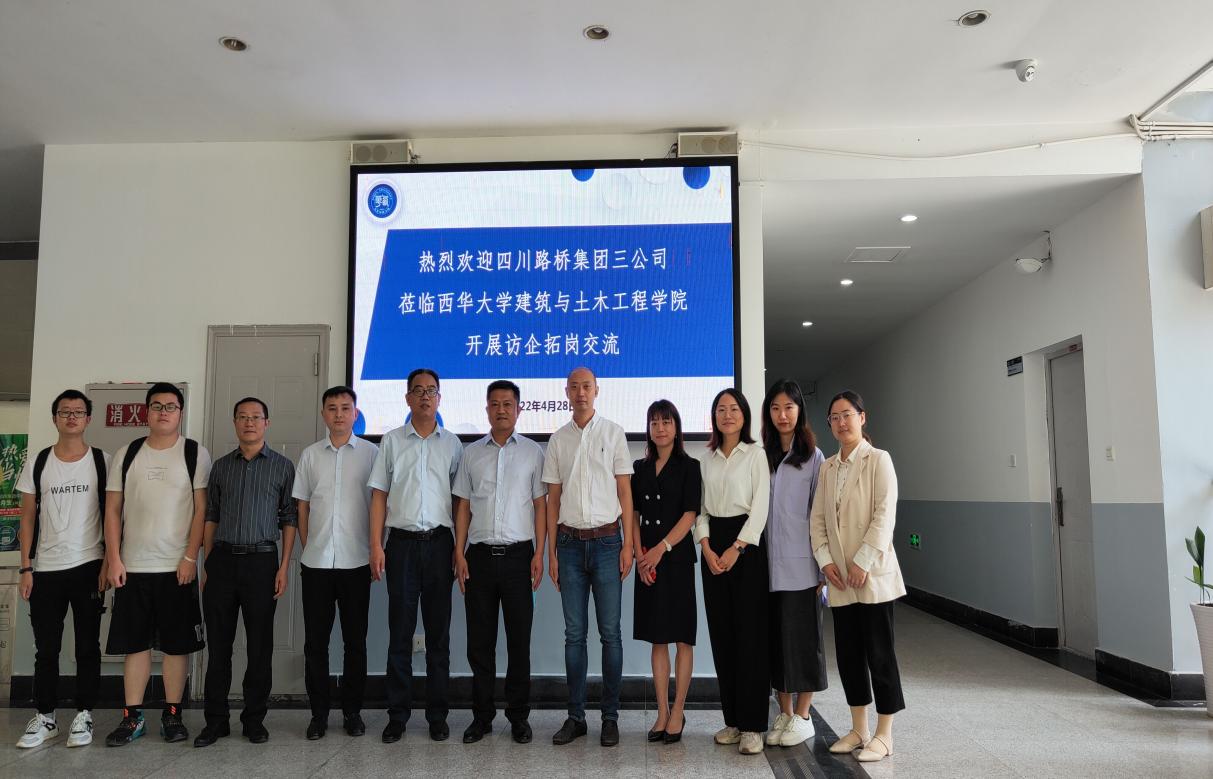4月28日上午,建筑与土木工程学院与四川路桥集团公路三公司共同举办的“访企拓岗”活动暨院企合作交流会在会议室6D-110举行。四川路桥集团公路三分公司党委书记夏勇、人力资源部经理杨焱、技术质量部副经理罗华平、党群办公室副主任柳鹏一行来校洽谈合作事宜,学院党委书记顾鸿飞出席此次交流会。