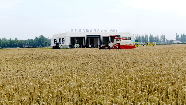 风吹麦浪,金黄的麦穗随风摇动。一台无人驾驶收割机在麦田中缓缓行驶,进行全程机械化收割。当粮仓装满后,无人驾驶收割机自动向运粮车发送信息。运粮车接到指令后立即行动,奔向无人驾驶收割机,伴随着轰鸣声,一粒粒饱满的小麦从机器里送了出来,行走收割、转弯掉头、仓满自动卸粮……在四川省首个“五良”融合无人农场,西华大学现代农业装备研究院的技术人员遥控指挥,完成了从小麦收割到脱粒装车的全过程,实现了整个收割卸粮无人化作业。