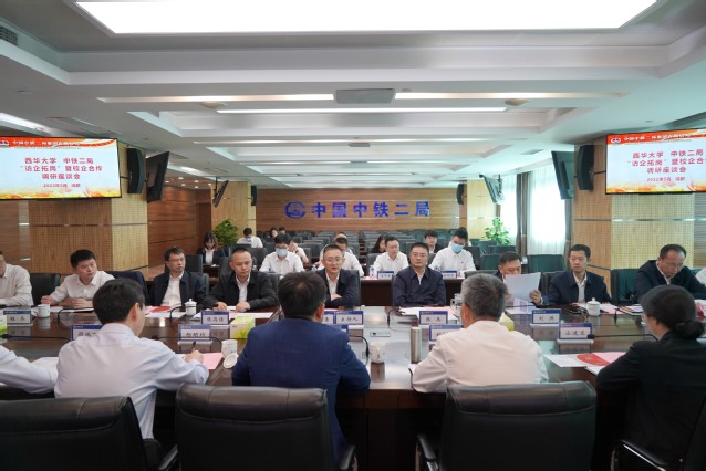 座谈交流时,刘树根从西华大学历史沿革、学生规模、办学成效等方面介绍了学校基本情况。他表示,西华大学是一所以工为主、多学科协调发展的综合性大学,建校62年培养了28万余名校友在祖国各地贡献力量,用人单位普遍认为,西华大学毕业生不仅“下得去、留得住、干得好”,而且“上得来、撑得起、能出彩”。开展访企拓岗促就业行动是学校深化校企合作的重要途径,也是学校提升人才培养质量、促进就业生高质量就业的迫切需求。长期以来,西华与中铁二局保持着良好的合作关系,中铁二局“不怕苦”的企业文化与西华大学“知难而进 自强不息”的精神相契合,希望双方加强人才培养合作,共同培养出企业所需、适合社会发展的应用型人才;加强科学研究合作,发挥高校人才优势和企业平台优势,深入开展科研攻关;加强高端人才引进合作,整合优势资源,共同培养高尖端人才。学校将根据企业的发展需要,完善人才培养方案,拓展合作领域,希望能够输送更多优秀毕业生到中铁二局工作,也真诚邀请中铁二局的各位领导来西华参观,并为人才培养提出宝贵意见。