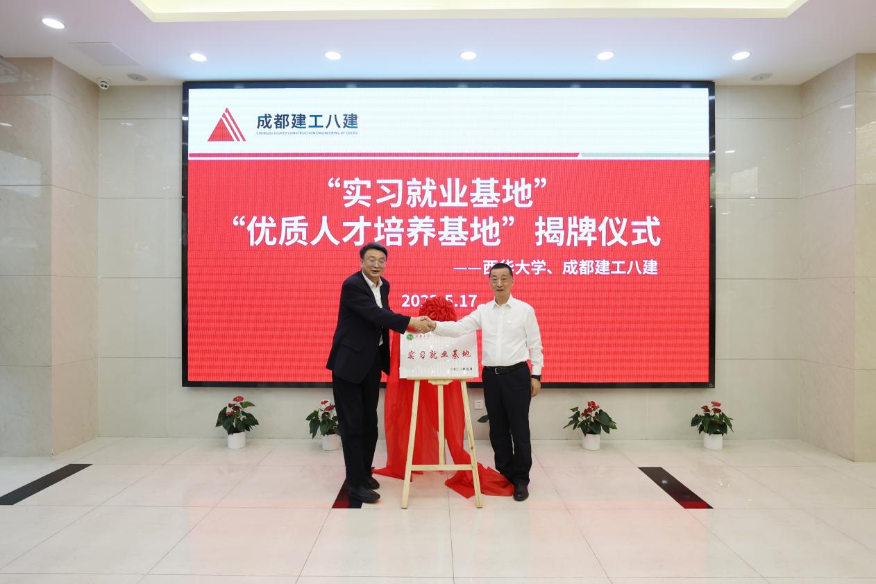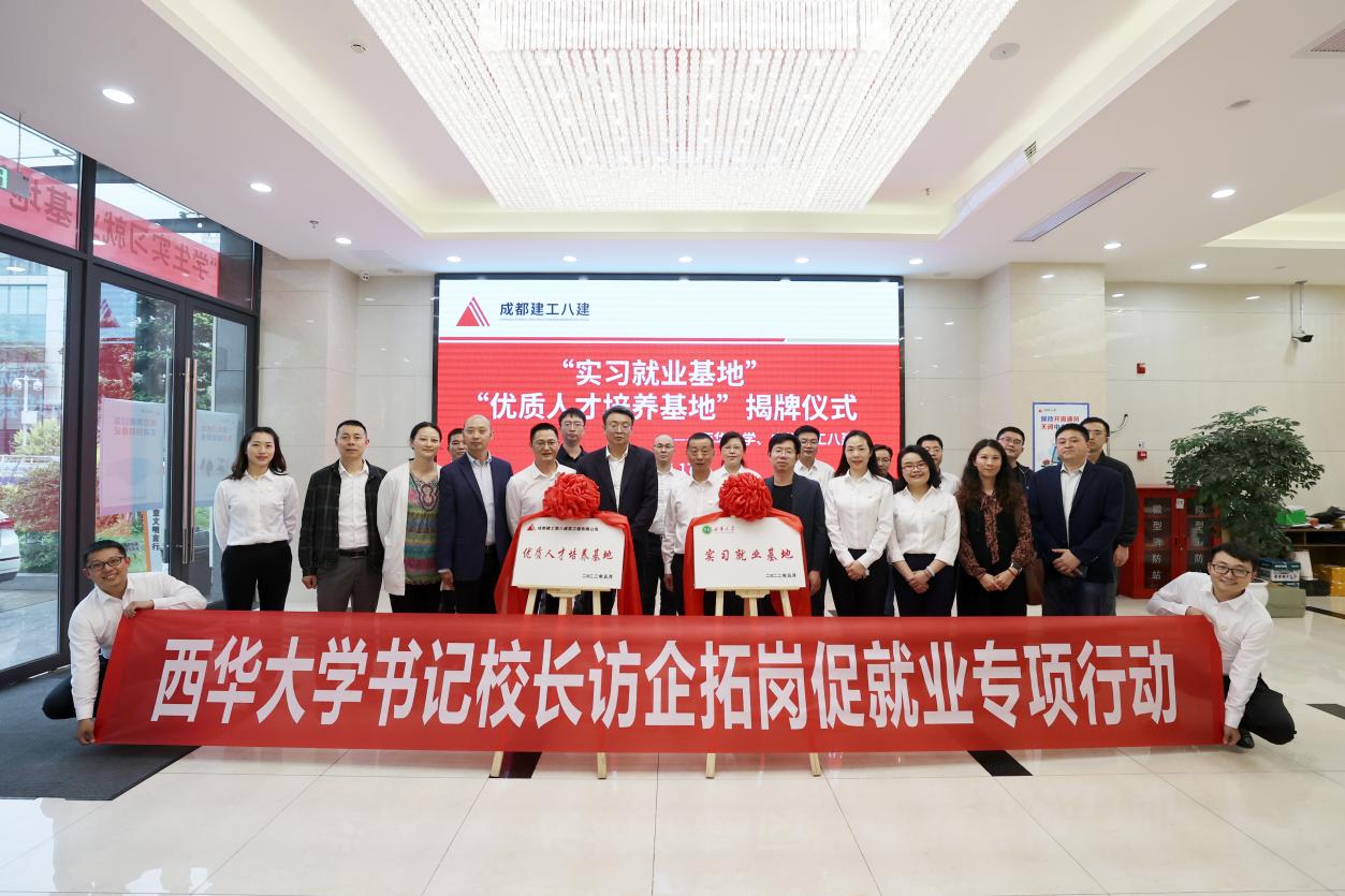 随后,成都建工第八建筑工程有限公司唐晓妍、王础了介绍公司人才招录、人才培养、科技创新等情况,鼓励以人才、技术、效益为结合点,健全完善多层次、多元化的管理制度和运行机制。09级校友刘宏伟、08级校友肖正铎作为西华大学校友代表表达了对母校的感谢,结合自身在企业的发展对学校人才培养工作提出了宝贵建议。最后,在校企双方达成合作共识下举行了揭牌仪式,并进行了合影留念。