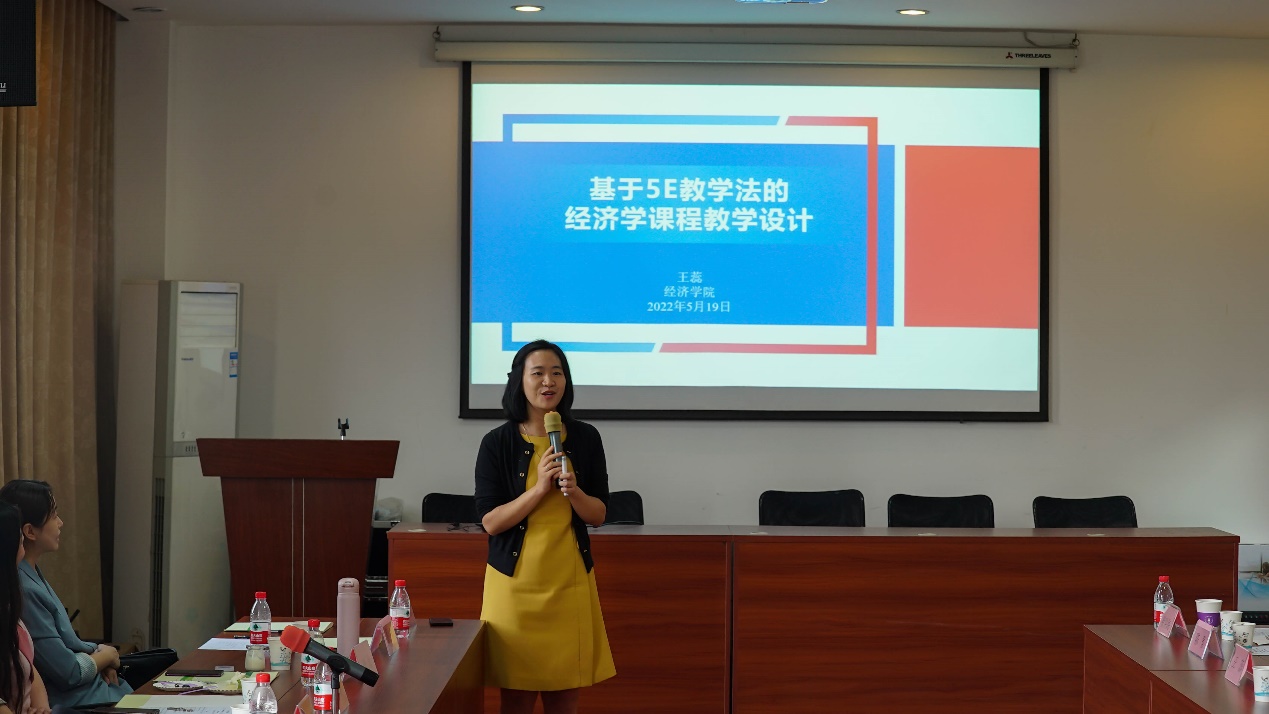 经济学院副教授王蕊结合近年来在教学科研和教学比赛方面的思考,围绕青年教师教学基本功做了《基于5E教学法的经济学课程教学设计》的报告。王蕊以德国著名教育家第斯多惠的“教学的艺术不在于传授本领,而在善于激励、唤醒和鼓舞”作为开场,回应了青年教师普遍面临的教学设计困惑。结合主讲课程《微观经济学》中的“消费者理性选择”,介绍了强调以学生为主体的探究式教学模式——5E教学法(Exploration, Engagement, Evaluation, Elaboration, Explanation, 5E)的教学过程及其对应的教学设计思路。