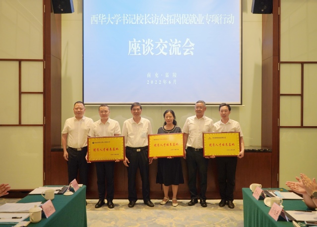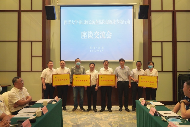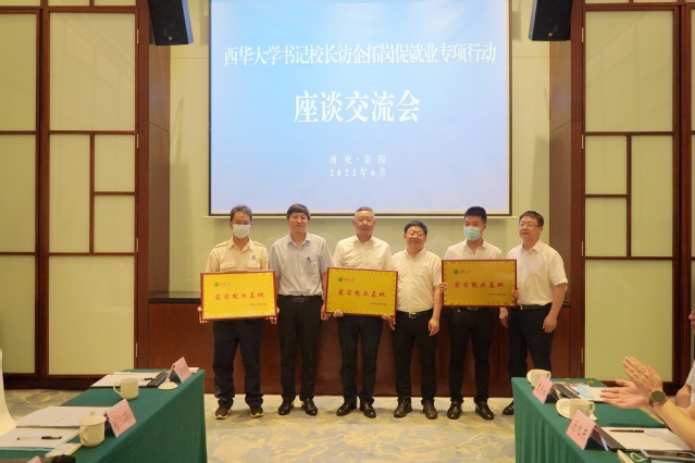 在与会人员的共同见证下,西华大学授予吉利四川商用车有限公司、四川燕京啤酒有限公司、四川能投化学新材料有限公司、南充联成化学工业有限公司、中商巨建消防装备科技有限公司、四川顺成纺织品公司、南充水投公司7家单位“西华大学实习就业基地”牌匾。南充水投公司、吉利四川商用车有限公司、四川顺成纺织品公司3家单位授予西华大学“优质人才培养基地”牌匾。