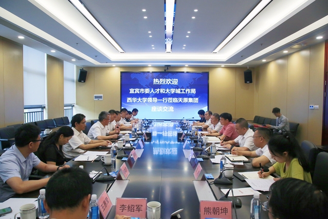与此同时,6月17日下午,校长刘树根、副校长费凌一行11人在宜宾市委人才和大学城工作局副局长曾振华的带领下,前往宜宾天原集团股份有限公司开展“访企拓岗促就业”专项行动,参观天原集团展厅,同集团党委副书记张宗才,集团副总裁、1998级校友杨建中,天亿新材料研发中心主任庞磊及校友代表座谈。双方就如何在人才培养、科学研究、高层次人才引进、校企共育、产教融合等方面开展深层次合作进行了深入交流。座谈会由天原集团人力资源部人力资源主任师刘丹主持。