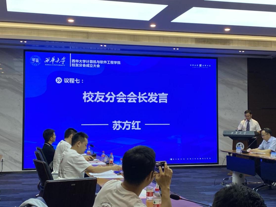 西华大学计算机与软件工程学院校友分会会长苏方红发言。他表示将不负重托,按照校友会章程认真履职,以校友会为平台,拓展多方位交流,促进共同发展。