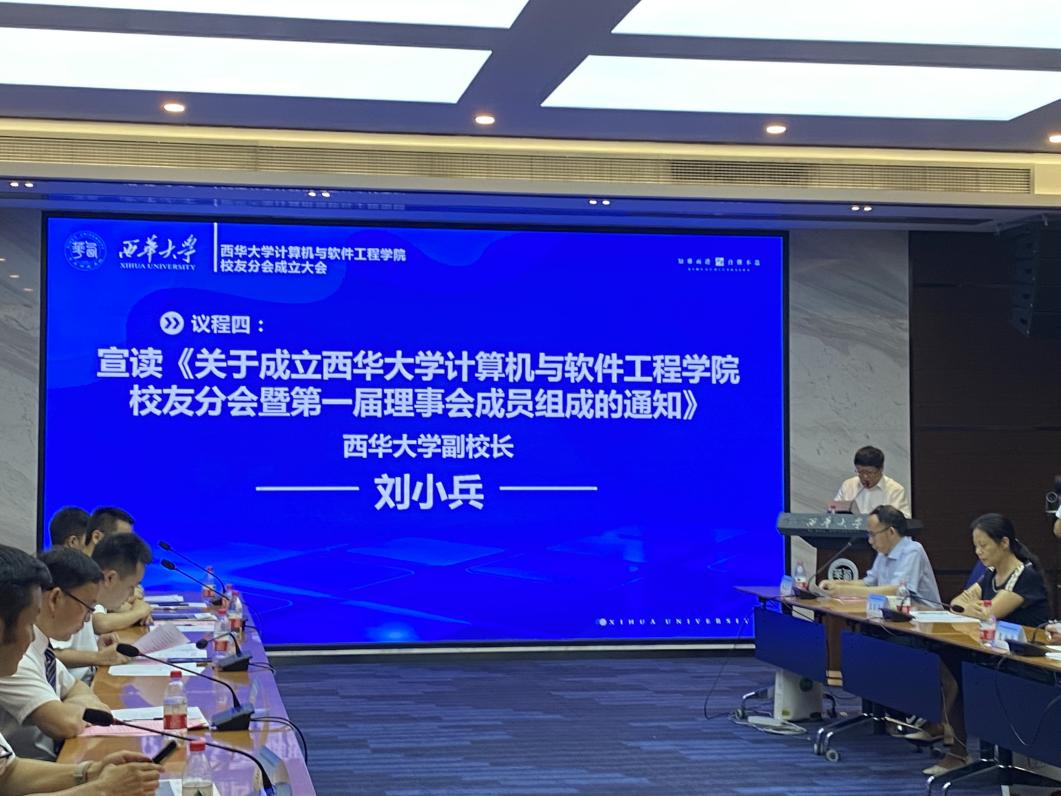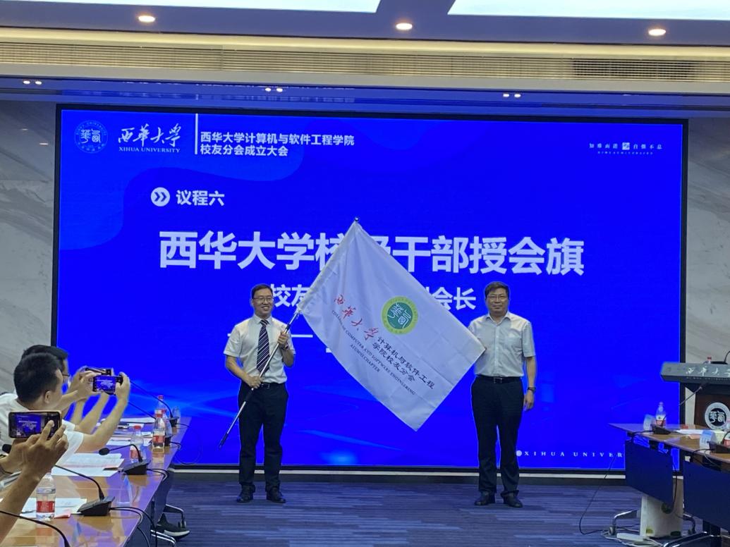 在副校长刘小兵宣读《关于成立西华大学计算机与软件工程学院校友分会暨第一届理事会成员组成的通知》后,校级干部、校友总会常务副会长王政书授予分会会旗。