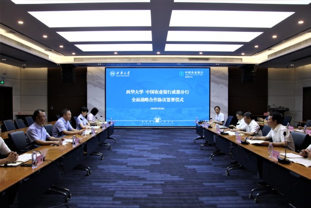 6月30日上午,学校在101会议室举行西华大学-中国农业银行成都分行全面战略合作协议签署仪式。中国农业银行四川省分行党委委员、副行长兼成都分行党委书记、行长王屹,农业银行成都分行党委委员、副行长朱波等一行6人到校交流座谈。校党委书记余孝其,副校长郑鈜出席签约仪式。郑鈜主持会议。