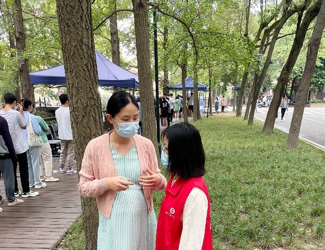 “这次志愿服务招募时间紧、任务重,同学们能够在短时间内迅速到位并开始工作,非常不容易。”校团委党员志愿者带队老师周雪莲说。在收到学校需要紧急招募全校核酸检测志愿者“集结号”之后,周雪莲立即发布志愿者招募通知、组建志愿者工作信息群、发布志愿者工作任务、安排志愿者上岗……疫情当前,怀孕7个月的她毫不犹豫主动下沉到一线,带领学生开展志愿服务工作。