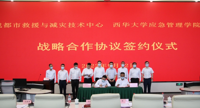 9月22日,西华大学应急管理学院和成都市救援与减灾技术中心战略合作签约仪式在成都市安全生产应急救援基地(国家危化学品应急救援成都基地)举行。成都市应急管理局党委书记、局长张明,党委委员、副局长左光磊,成都市救援与减灾技术中心、成都市城市安全与应急管理研究院相关领导负责人;校长刘树根,副校长郑鈜,四川省应急管理学院常务副院长、西华大学原党委副书记王政书出席签约仪式。左光磊主持座谈会。