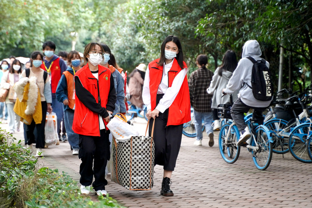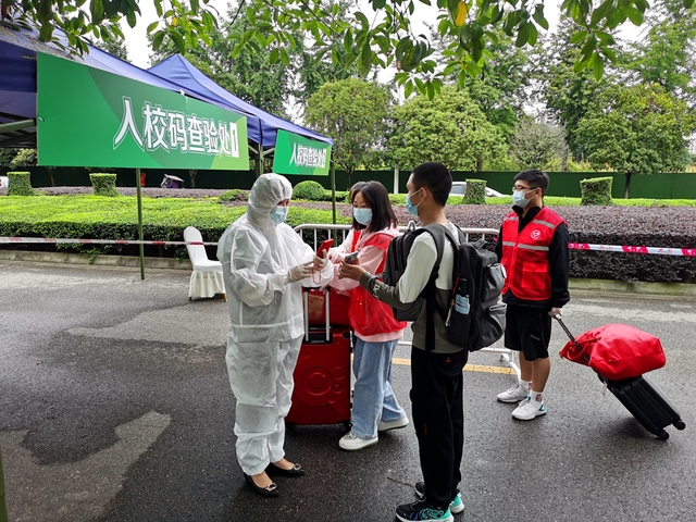 报到现场,按照疫情防控要求,新生们戴好口罩、测量体温,在校门查验入校码、行程卡、健康码、48小时核酸阴性证明后,在安保人员和志愿者的引导下到指定区域进行核酸检测,背上行囊,继续出发;前往寝室的道路上,到处都有迎新志愿者和工作人员,为新生指引路线、搬运行李,热情地帮助刚踏入校园的萌新熟悉校园生活;大巴、小白龙齐出力,帮助萌新们运送行李,抵达宿舍楼下,刷“报到码”、领钥匙、签上名字,顺利为报到画上圆满句号,正式成为西华大学的一员。
