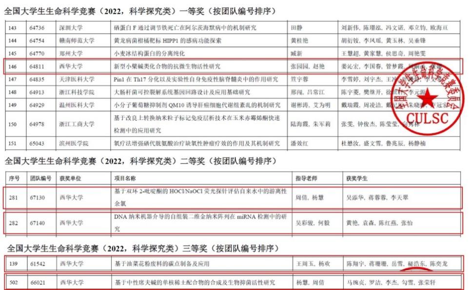 近日,由全国大学生生命科学竞赛委员会等单位主办的全国大学生生命科学竞赛(2022,科学探究类)已落下帷幕。理学院化学系学子在全国大学生生命科学竞赛中再获佳绩,共获得全国一等奖1项,二等奖2项,三等奖2项,获奖质量及数量再创新高。