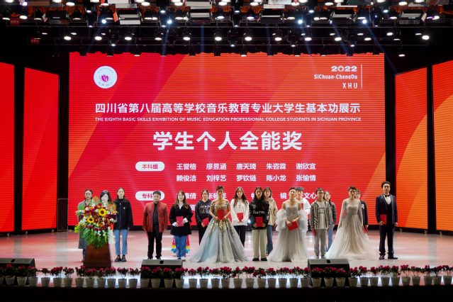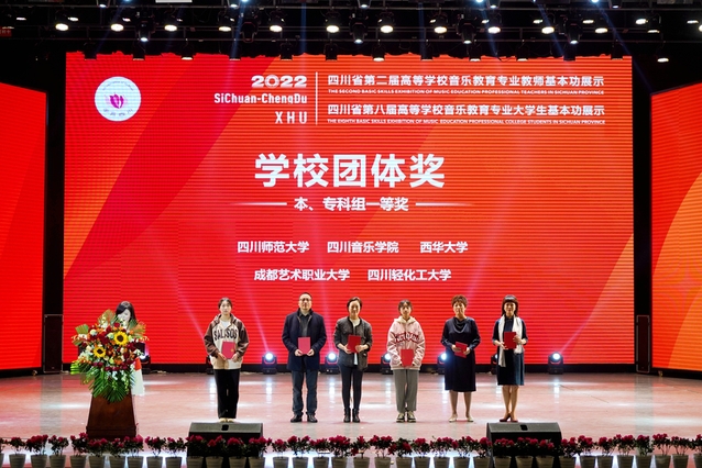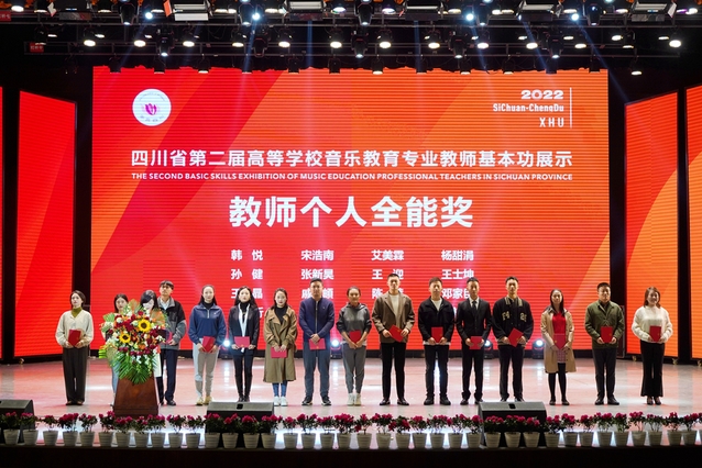 经过五天激烈角逐,10月28日中午,四川省第二届高等学校音乐教育专业教师基本功展示和四川省第八届高校音乐教育专业大学生基本功展示活动落下帷幕。在音乐教育专业教师基本功展示中,19所高校获优秀组织奖;16名教师荣获个人全能奖一等奖;个人单项奖中,16名教师获教学展示(微课)一等奖,4名教师获专业技能展示(声乐演唱)一等奖、2名教师获钢琴演奏一等奖、3名教师获中外器乐演奏一等奖、1名教师获指挥一等奖、2名教师获即兴弹唱一等奖、1名教师获舞蹈一等奖、1名教师获钢琴伴奏一等奖;在审美和人文素养展示(经典音乐作品赏析)单项奖中,15名教师获一等奖。在本科生基本功展示活动中,四川师范大学、四川音乐学院、西华大学获学校团体一等奖;10名学生获个人全能一等奖;60人次获个人单项奖。在专科生基本功展示活动中,成都艺术职业大学、四川轻化工大学获学校团体一等奖;7名学生获个人全能一等奖;60人次获个人单项奖。西华大学获团体一等奖、优秀组织奖;3名教师获个人全能一等奖,1名教师获专业技能展示钢琴演奏单项一等奖;2名学生获本科组个人全能一等奖。