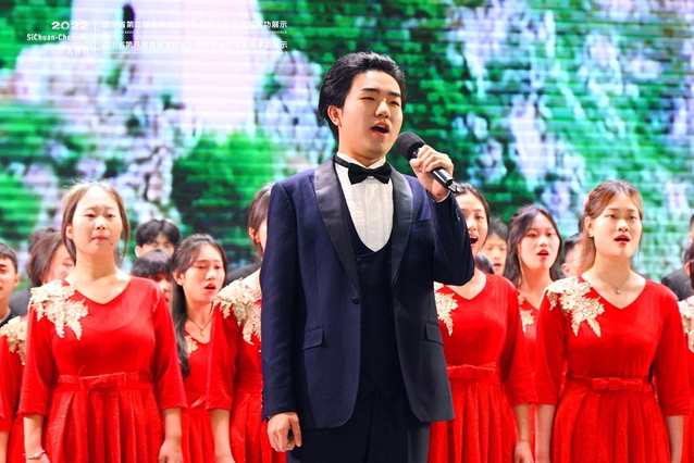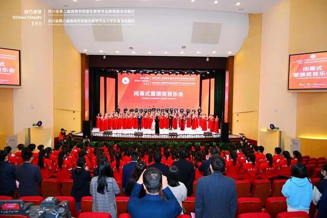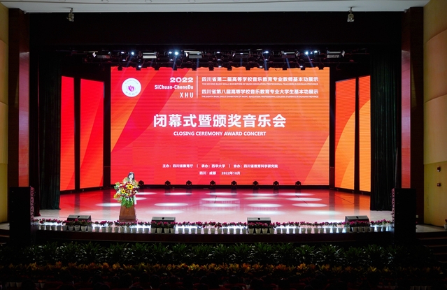 下午四点,展示活动的闭幕式暨颁奖音乐会在西华大学大剧场举行。省教育厅体卫艺处处长唐克红,校党委副书记张力,副校长费凌,全体评委,各高校领队、教师代表和学生代表参加了闭幕式暨颁奖晚会。省教育厅体卫艺处杨荔主持闭幕式暨颁奖音乐会。