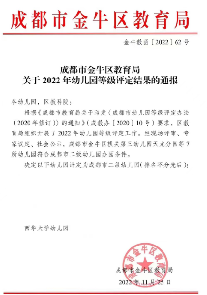 近日,成都市金牛区教育局发布《关于2022年幼儿园等级评定结果的通知》,经过现场评审、专家议定、社会公示,西华大学幼儿园被评定为成都市二级幼儿园。