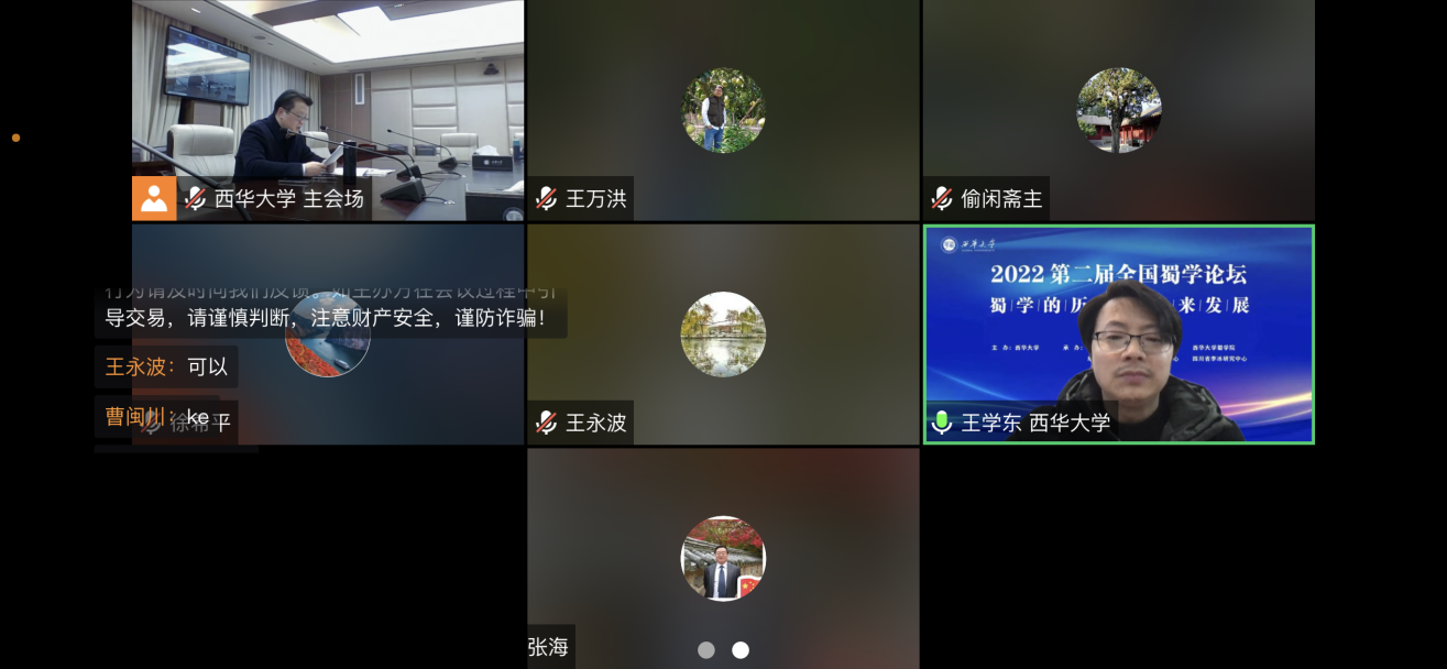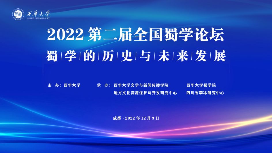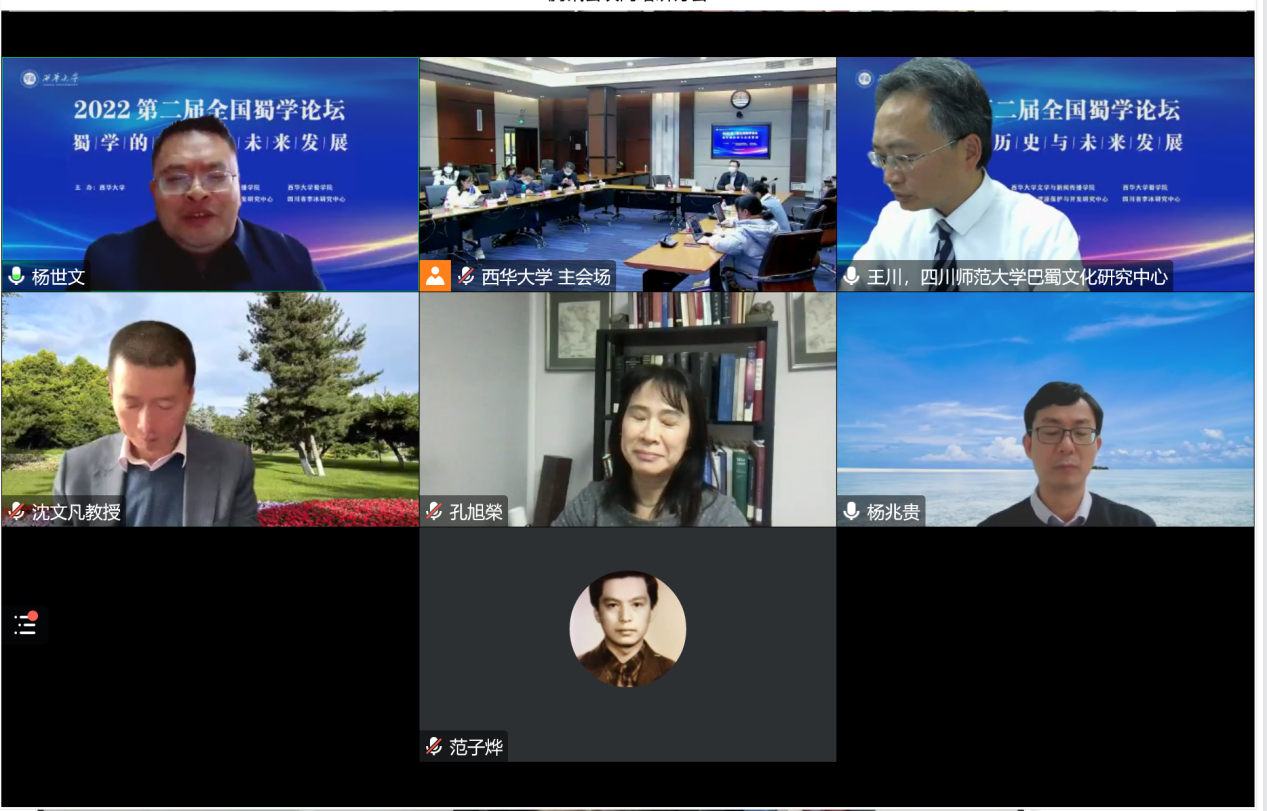 12月3日,“2022第二届全国蜀学论坛——蜀学的历史与未来发展学术研讨会”在西华大学举行。本次论坛由西华大学主办,文学与新闻传播学院、四川省第一批全省高校中华优秀传统文化学院西华大学蜀学院、地方文化资源保护与开发研究中心、四川省李冰研究中心、蜀学研究中心承办。论坛采用线上线下相结合的方式召开,来自来自美国肯恩大学、日本小樽商科大学、新加坡国立大学、澳门大学、中国社会科学院、四川大学、西南大学、华中师范大学、西北师范大学、吉林大学、贵州财经大学、闽南师范大学、西华大学、四川师范大学、西华师范大学、成都大学、成都锦城学院、四川省文史馆、四川省社会科学院、四川省文物考古研究院、四川省图书馆、成都市文史馆、四川文化艺术学院等30余所高校及科研院所,200余位专家学者相聚云端,共议蜀学的历史与未来发展大计。