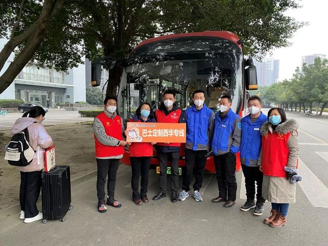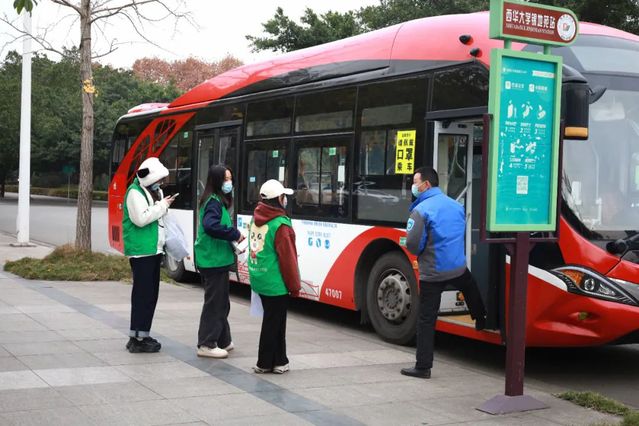 为减少返乡途中转车的疫情风险,学校坚持“以学生为本”的理念,联合成都市公交集团于12月11日起开行“巴士定制西华专线”,从学校直达成都东站、天府机场、双流机场,畅通学子返家路。