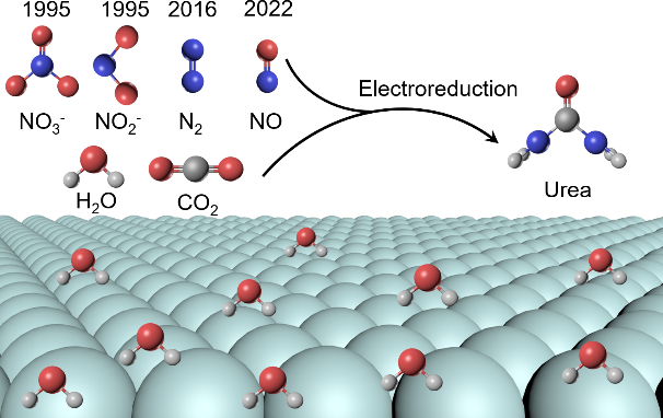 尿素不仅是农作物生长过程中最重要的氮肥,也是生产重要化工产品(例如脲-三聚氰胺-甲醛树脂,脲甲醛和巴比妥酸盐等)的关键化学原料。目前,传统的尿素合成工艺存在反应条件苛刻,环境污染以及对设备要求高等问题,因此,亟待研发反应条件温和,绿色可持续的尿素合成技术以替代传统的两步法合成尿素工艺。通过电化学路径将环境中的温室气体CO2和硝酸盐水体污染物共还原为具有更高附加值的尿素,对实现碳中和、碳/氮循环利用、间歇式能源有效存储以及缓解环境污染等问题具有重要意义。