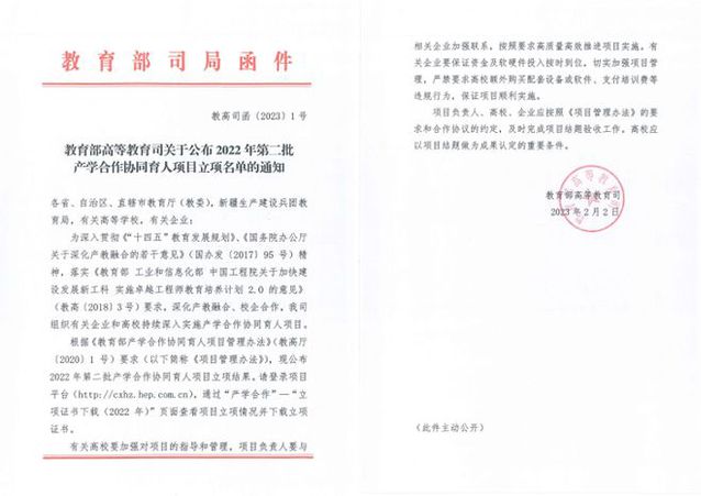 近日,教育部高等教育司发布了《关于公布2022年第二批产学合作协同育人项目立项名单的通知》(教高司函〔2023〕1号),我校本次获批43项,至此,我校2022年教育部产学合作协同育人项目立项数达80项。