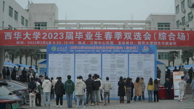 为深入学习贯彻党的二十大精神,落实党中央、国务院“稳就业”“保就业”决策部署,抢抓春招关键期、全力攻坚促就业,我校于3月2日在郫都校区三教中心花园组织举办“万企进校园”——西华大学2023届毕业生春季双选会。学校招生与就业处、各学院相关领导及毕业班辅导员组织3000余名毕业生参加双选会,为学生现场推荐岗位、答疑解惑。