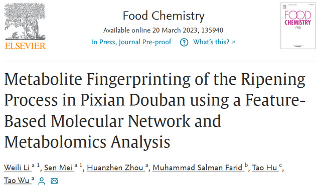 3月20日,食品与生物工程学院吴韬课题组在食品国际Top期刊Food Chemistry(Q1,IF: 9.231)发表题为“Metabolite Fingerprinting of the Ripening Process in Pixian Douban using a Feature-Based Molecular Network and Metabolomics Analysis”的研究性论文。