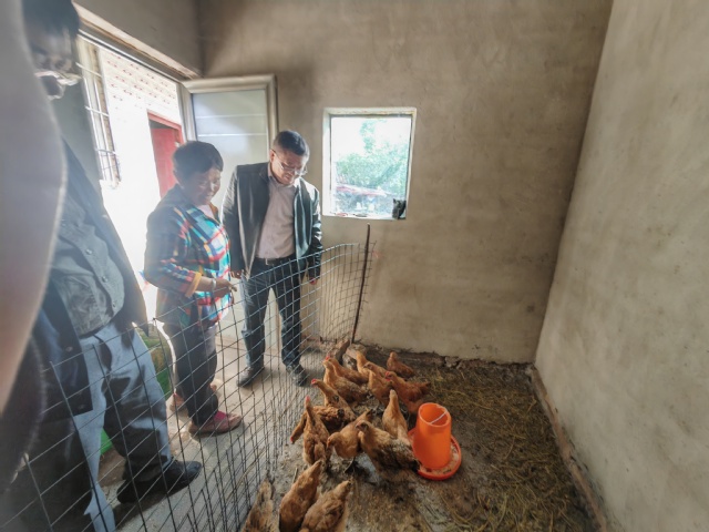 随后,刘小兵一行前往了解学校3月初向村上161户家庭发放的每户15只特色鸡苗的养殖情况。在脱贫户家中,看到长势良好的鸡苗,他详细询问鸡苗产蛋时间、鸡蛋和肉鸡售卖价格等。脱贫户非常感谢西华大学的帮扶,表示这批鸡苗品种选得好,后续会给每户带来不小的增收。