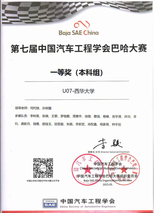 巴哈大赛(BAJA)共包括两大类6个项目,分别是静态项目的赛车设计、营销及成本与分析;动态项目的操控赛、单圈计时赛、耐久赛和牵引赛;设置了总成绩、各单项成绩等奖项。在汽车与交通学院何灼馀老师的指导下,我校19余名学子组成的西华大学虎鲨车队,历经一年的设计、制造、组装调试和驾驶赛车训练后,参加了此次角逐。最终,西华大学巴哈车队获得年度总亚军,总成绩一等奖,操控赛第一名,耐久赛第三名,单圈计时赛第三名,全体参赛队员获得中国汽车工程学会颁发的见习工程师证,充分体现出西华学子的风格及赛车水平,为学校赢得了荣誉。