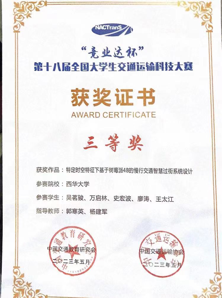 今年我校共有10件作品参加本次比赛,最终1件作品入围决赛。赛前,专业教师郭寒英、杨建军对学生作品进行多轮指导及打磨,为参赛团队保驾护航,不断提升参赛作品的综合竞争力。最终,我校学生吴茗骏、万启林、史宏波、廖涛与王太江的参赛作品“特定时空特征下基于树莓派4B的慢行交通智慧过街系统设计”获得全国三等奖。近年来,我校学子连续多次在该项赛事上斩获奖项、屡获佳绩,在贯彻落实培养交通运输方面科技创新人才上有了新的突破。