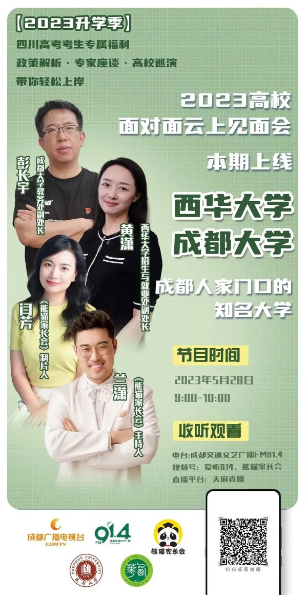 5月28日上午9:00,成都人民广播电台《熊猫家长会》高考季特别策划节目——2023面对面云上见面会邀请我校招生与就业处副处长黄潇做客直播间,介绍学校今年的招生政策以及今年招生的新变化。节目在成都交通文艺广播FM91.4、视频号“爱听914”、熊猫家长会和天府直播平台上同步直播。熊猫家长会公众号上以“高考100问:多少分可以上西华大学?”为题对此进行了报道。报道全文如下: