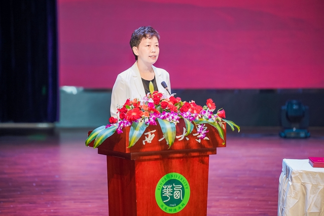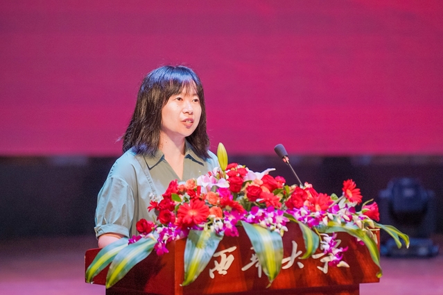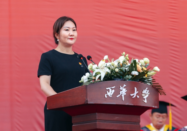 马克思主义学院2020级研究生张潇双母亲王志洪作为家长代表发言。她对孩子大学期间的成长和取得的成绩表示欣慰和骄傲,对师长们的无私教导和辛勤付出表示衷心的感谢。她代表家长们鼓励同学们带着初心和梦想,脚踏实地走好每一步,秉持从西华大学汲取的爱与力量,主动融入这个伟大的时代,服务国家,实现自我。