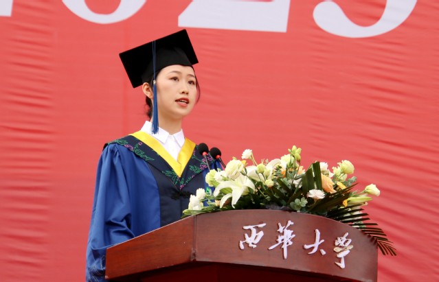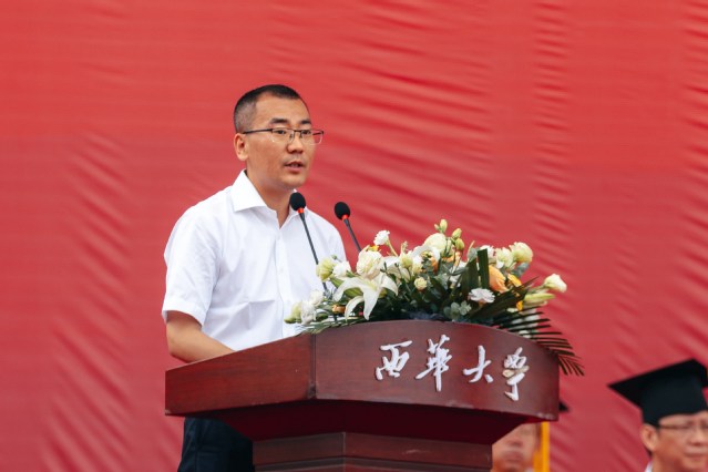“从今天开始,你们将从西华校园出发,走向充满挑战的人生。你们的肩上有清风明月,更有家国使命。”校党委书记刘树根指出,大家共同见证了新中国成立70周年、中国共产党成立100周年、党的二十大胜利召开等重大历史时刻,一起走过了极不平凡的三年抗疫之路,携手经受住了一场艰苦卓绝的历史大考,广大西华学子在风雨中历练、在奋斗中成长,青春岁月熠熠生辉,共同经历让大家把个人的前途命运、学校的事业发展与民族复兴的伟大进程紧密相连。他勉励青年学子牢记母校的期望和嘱托,不负时代,不负韶华,在青春的赛道上奋勇争先,跑出西华人的风采。