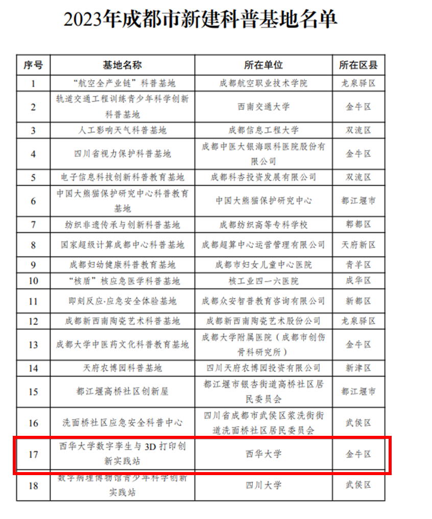 成都市科学技术局、中共成都市委宣传部、成都市教育局、成都市科学技术协会对全市2023年申报的科普基地进行了综合评审。依托材料科学与工程学院“新材料制备与加工虚拟仿真实验教学中心”(四川省省级实验教学示范中心)等相关平台申报的“西华大学数字孪生与3D打印创新实践站”获批2023年成都市新建科普基地,有力扩大了我校在数字孪生及3D打印方面的科普影响力。