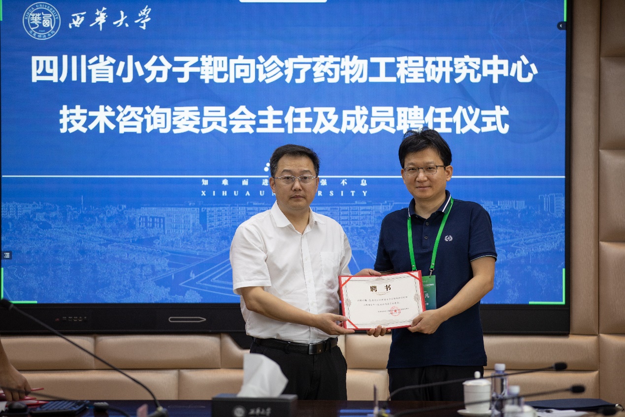 经研究讨论,决定聘任复旦大学张凡教授为四川省小分子靶向诊疗药物工程研究中心技术咨询委员会主任,四川大学李坤教授为副主任,聘任吉林大学杨柏教授、中国科学院上海药物研究所杨财广研究员、北京大学谢海燕教授、大连理工大学樊江莉教授、中国科学院大连化学物理研究所徐兆超研究员、山东大学李敏勇教授、西北大学李剑利教授、山西大学阴彩霞教授、华东理工大学杨有军教授、武汉大学翁小成教授、四川大学李国菠教授为委员。西华大学副校长郎方年为技术咨询委员会主任、副主任及其他委员颁发聘书。副校长郎方年和技术咨询委员会主任张凡教授共同为“四川省小分子靶向诊疗药物工程研究中心”揭牌。