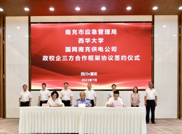 会上,在与会领导的共同见证下,南充市应急管理局、西华大学、国网南充供电公司政校企三方合作框架协议正式签约。国网南充供电公司总经理、党委副书记唐敏,西华大学应急管理学院院长舒志乐分别作了致辞。